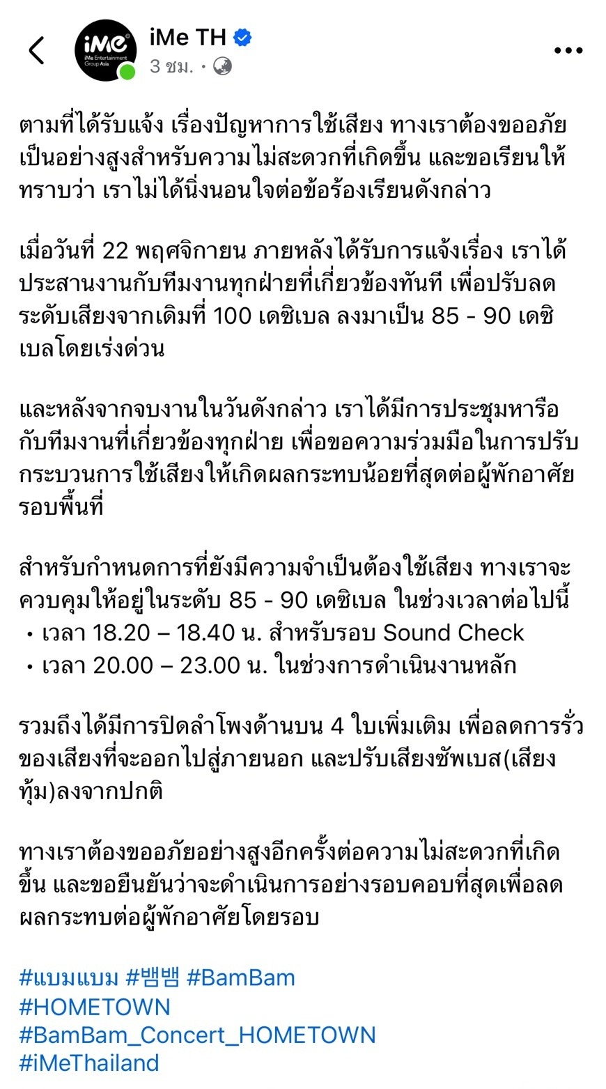 Many reported ongoing disturbances without knowing the source or reason for the increased volume. Based on the latest information, the noise was coming from a large open air concert held at Muang Thong Thani. Due to changing wind direction during the event, the sound traveled farther than anticipated, reaching Nichada and nearby communities. Event organizers have since issued an apology for the inconvenience and have confirmed that they will explore measures to help minimize similar impacts in the future, by reducing the noise output.
